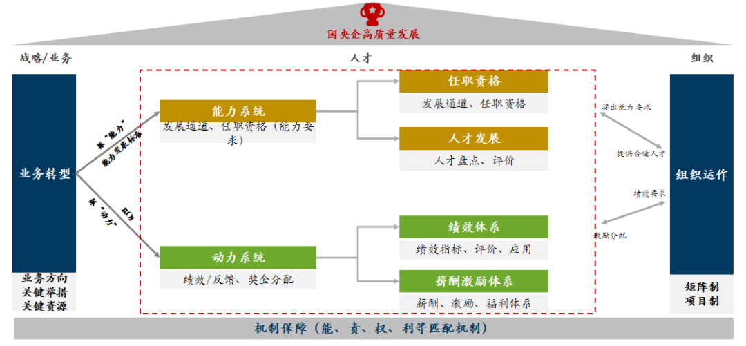 国央企在人才管理中,围绕“公司战略方向和业务特点”,紧抓人才的“动力”和“能力”支持机制,通过“战略-人才-组织-机制”深度耦合,牵引人才提升能力,主动作为,共同实现高质量发展。