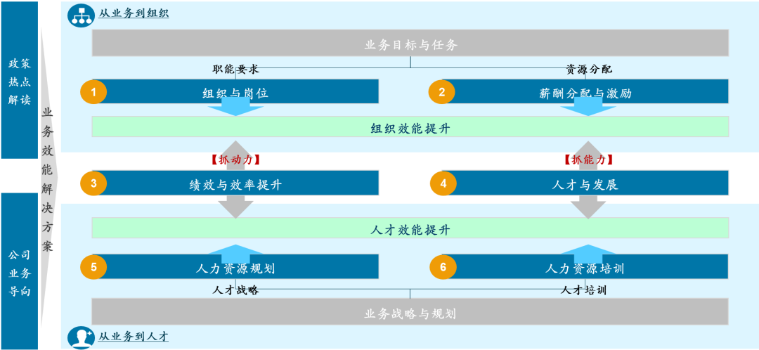 从业务出发,围绕业务需要,构建“从业务到组织、到人才、到激励、到人岗匹配”,实现组织与人才效能提升。