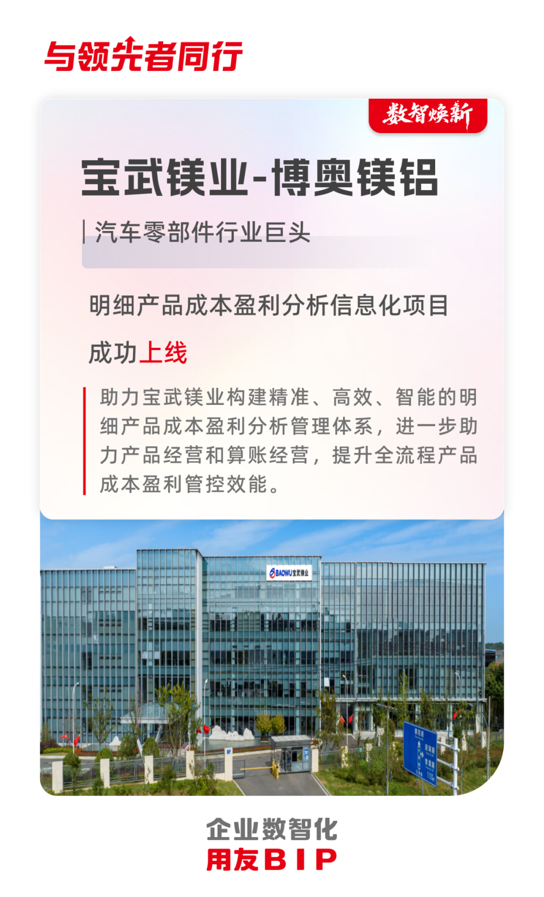 宝武镁业旗下博奥镁铝是国内乃至全球镁合金压铸产业龙头企业之一,是全球镁合金压铸汽车零部件重要供应商。此次宝武镁业-博奥镁铝BIP旗舰版明细产品成本盈利分析项目的上线,既是满足公司产品成本盈利精细化管理和推进算账经营的关键行动,更是宝武镁业-博奥镁铝迈向数智化新高度的重要标志。用友将凭借自身技术与产品优势,助力宝武镁业构建精准、高效、智能的明细产品成本盈利分析管理体系,进一步助力产品经营和算账经营,提升全流程产品成本盈利管控效能,为宝武镁业的稳健发展注入数智动力。